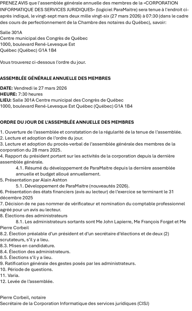 RAPPEL: Avis de convocation à l’assemblée générale annuelle CORPORATION INFORMATIQUE DES SERVICES JURIDIQUES